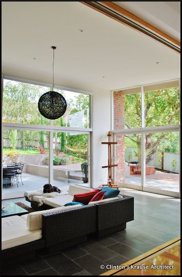 Once through the front door, however, this impression of an almost-fortress like structure is replaced with the sensation of entering a cathedral – expansive high rooms are flooded with natural light from vast panels of north-facing windows and the raking ceilings soar majestically throughout, echoing the lines of the elegant butterfly roof that is the crowning glory of this home.