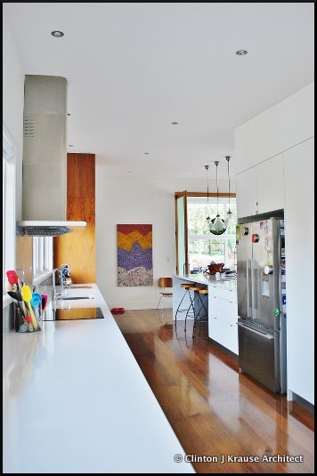 The configuration of the original kitchen is also very innovative for 1958. It features a long, wide galley that provides huge expanses of benchspace with designated areas for preparation, serving and eating.